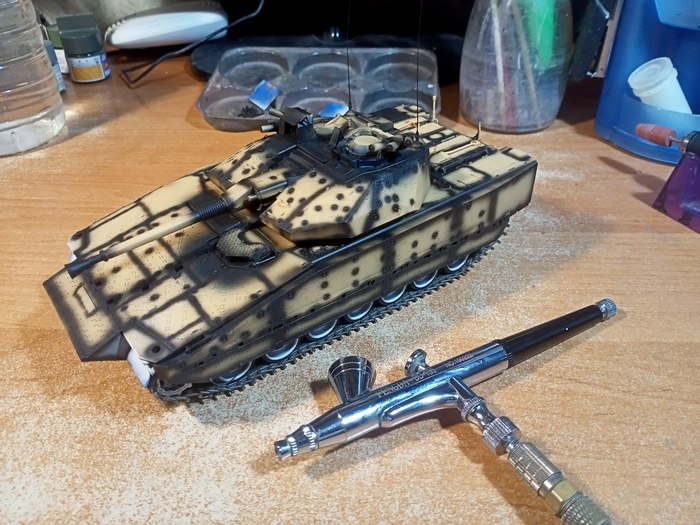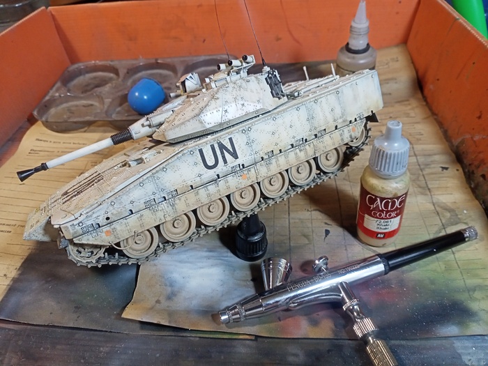 И завершим пачкание модели надуванием запылений аэрографом. Использован тот же цвет Хаки, ибо он прекрасно подходит для имитации желтоватой пустынной пыли.