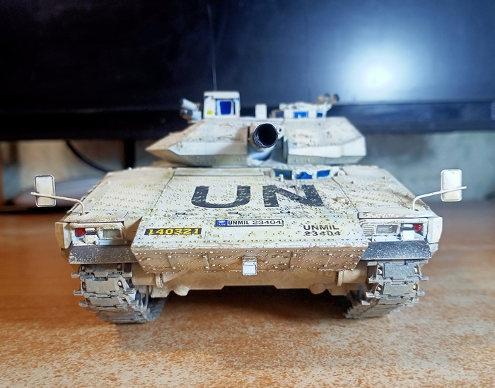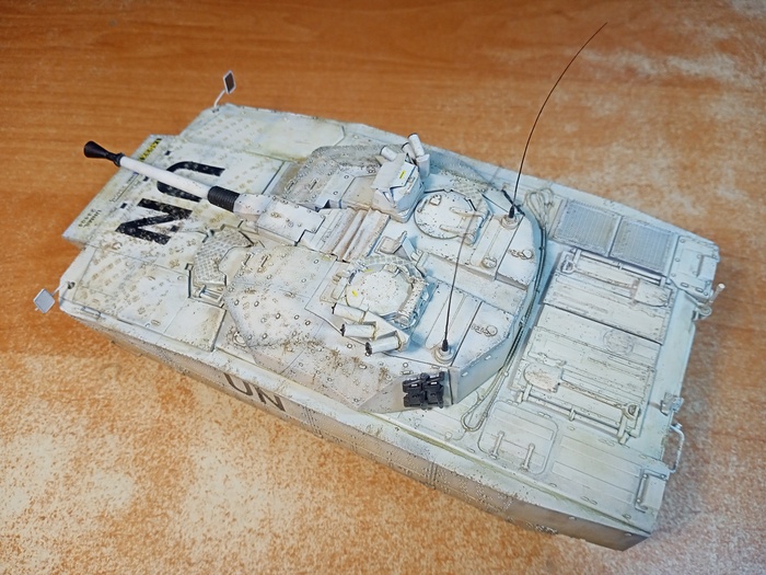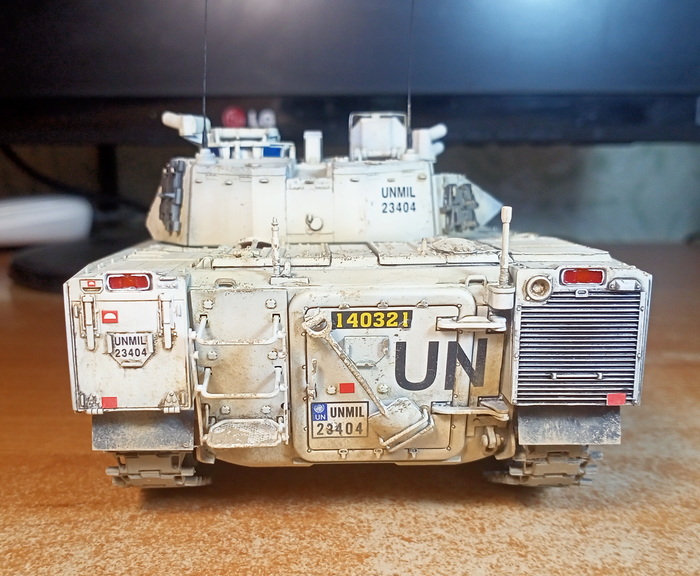 На фотографиях из сети машины CV90-40 довольно часто сильно запылены, касается это и белых машин ООН. Я поставил для себя задачу сделать модель довольно грязной, но конечно же не ржавой и побитой машины. Начинаем везеринг с акриловой смывки Vallejo Wash, использую цвета Чёрный, Светло-Коричневый, Европейская Грязь и Пустынная Пыль по принципу "чем выше, тем светлее". Исключение - чёрный, его наношу для имитации потёков ГСМ около горловины бака, а также в различные решётки для резкого оттенения.