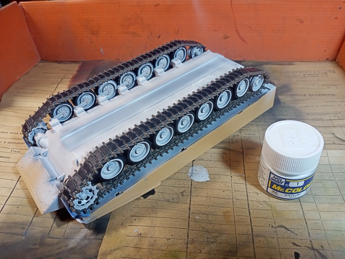 Промежуточный этап окраски, при этом гусеница оставлена неокрашенной. Цвет пластика вполне сойдёт для базового цвета.