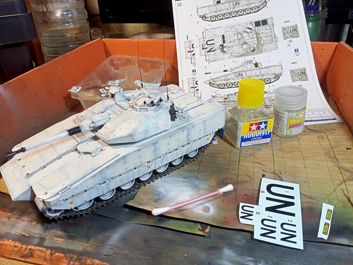 Вооружившись химией для размягчения декалей Tamiya Mark Fit Strong, приварим декали на места. Особенно непросто было с крупными надписями UN на ВЛД и бортах. Поскольку у меня уже спрашивали читатели, опишу свой способ применения этой химии (не претендую, что он единственно верный). Я сперва замачиваю декаль в обычной воде, затем наношу каплю-другую химии на модель в место, где будет декаль. Переношу саму декаль, позиционирую, убираю излишки жидкость ватной палочкой. Затем поверх самой декали наношу ещё каплю-другую химии, и оставляю на 2-15 минут чтобы дождаться размягчения. Время настолько разное, потому что декали разных фирм ведут себя неодинаково. Когда плёночка достаточно размягчилась и стала податливой, я вдавливаю её в расшивку и прочие неровности ватной палочкой, по возможности разглаживая все складки и убирая пузырьки воздуха. Важно: декали стоит наносить на глянцевую поверхность, а затем после высыхания защищать дополнительным слоем глянцевого лака.