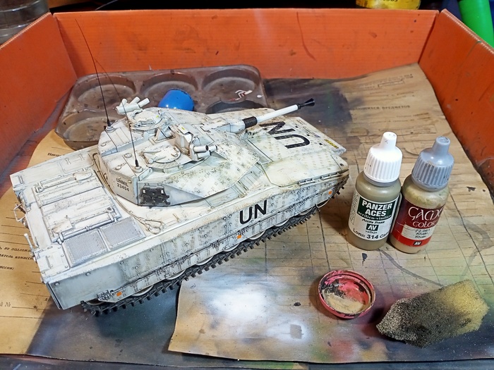 Следующий этап - чиппинг кусочком поролона с использованием акрилов Vallejo Game Khaki и Panzer Aces Canvas. Выбраны цвета песочка и грязи без намёков на красный и коричневый, дабы чиппинг выглядел, как следы обуви и брызги грязи, а не проступившая ржавчина.
