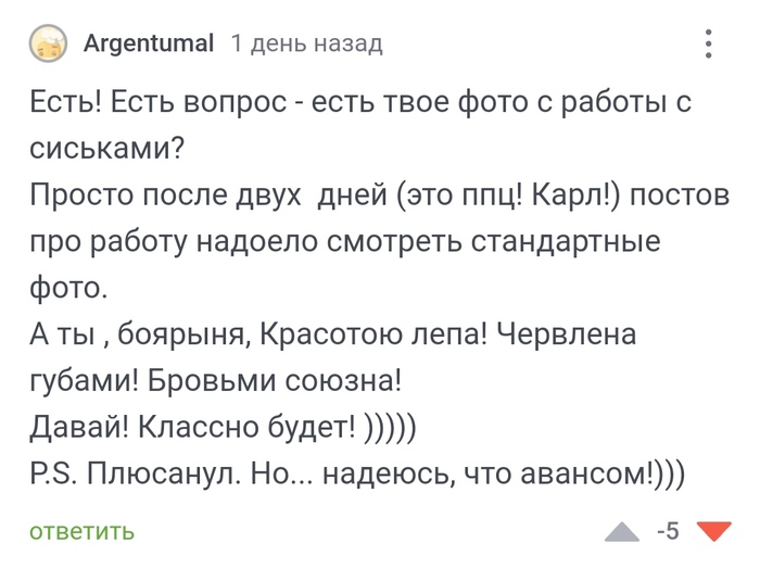 Пока идёт волна постов про профессии, где прекрасные люди обоих полов выкладывают свои живые фотографии в сфере своей деятельности, обязательно найдутся долбаебы, которые пишут прекрасным девушкам, женщинам и главное профессионалам вот такое вот: