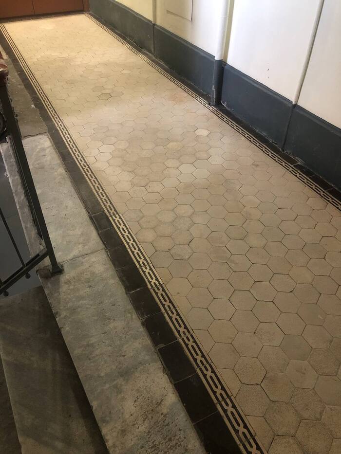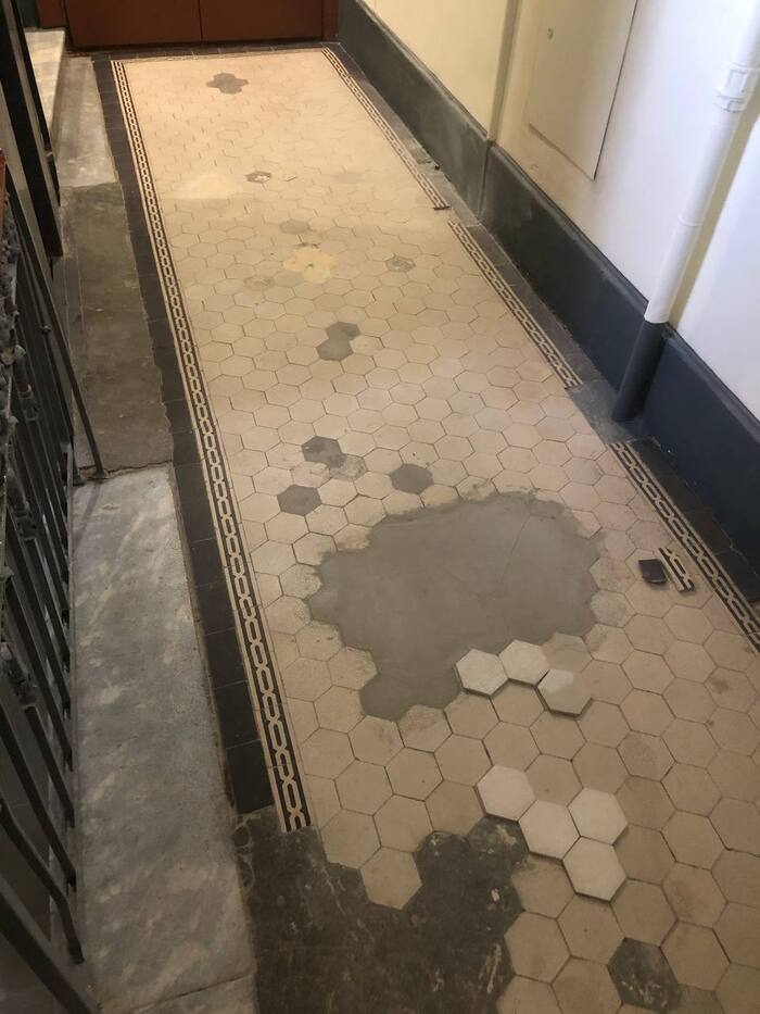 «Не очень красиво» — подумали в какой-то момент проживающие на этом этаже люди. А что делать? Метлаха такого нет больше. Даже у антикваров. Новую плитку туда положить? Будет как бельмо на глазу, потому что старая плитка на новую совсем не похожа. И вообще, хочется сохранить налёт прошедших времён, а не избавиться от него. Думали-думали и позвали нас на помощь. Керамистов старейшей в России реставрационной мастерской.