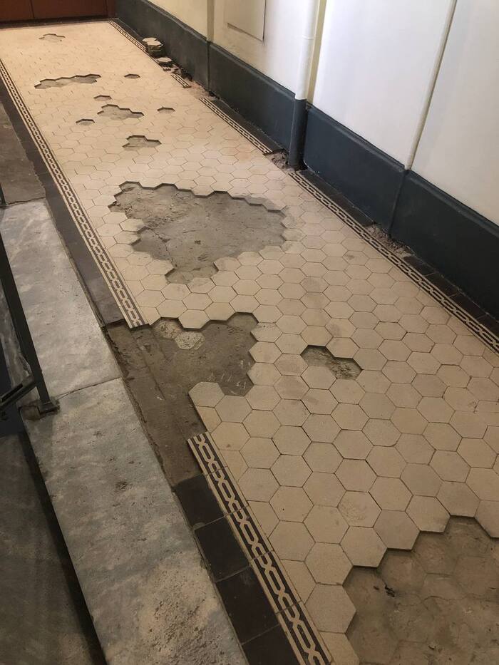 Есть в Питере дом. Довольно старый и известный. А в доме том на полу общественных пространств плитка метлахская лежала испокон века. Долго ли, коротко ли, плитка эта местами отвалилась. И кто-то даже замазал утраченные места цементом со всей пролетарской решимостью. Прямо так: