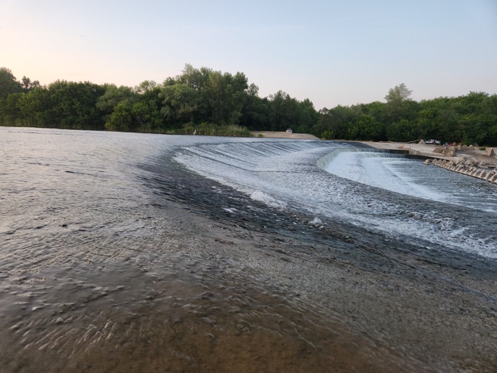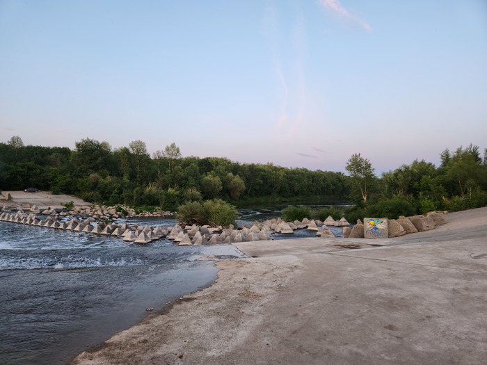 Все "ступени" рукотворного водопада выложены из бетонных плит. Ниже по течению расположены волнорезы, так называемые тетраэдры, которые замедляют течение.