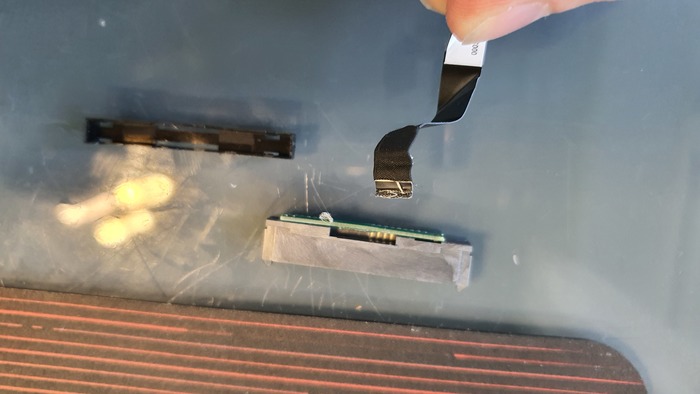 В какой-то из разборов я отвлёкся на винтик, который не хотел выкручиваться и один-единственный мешал мне снять крышку. А поскольку внимание моё было уже дестабилизированно, то я совсем забыл отсоеденить шлейф от ssd накопителя.