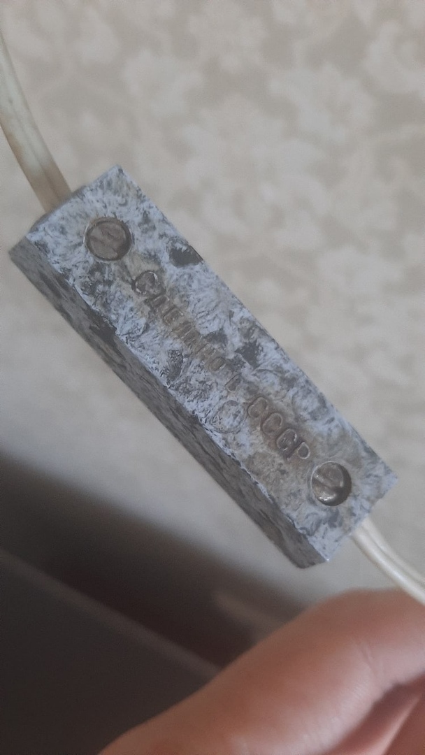 Карболитовый выключатель с гордой надписью: "Сделано в СССР". Немного запачкан, всё-таки лампа висела на кухне и трогалась порой не очень чистыми руками.