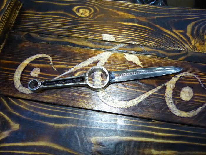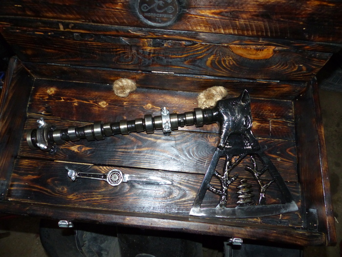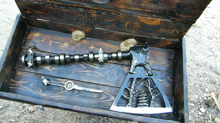 Ручку взял от распредвала какойто машины, не очень удобно хотя в руке как влитой лежит, кулачки расположил так что они как раз под пальцы ложатся. Сбил ящик из досок от паллет, и закрепил внутри вместе с ножиком сделанным из шатуна и напильника (это другой проект был). Для первой работы с обьемным навариваемым сваркой изображением и топором вроде терпимо.