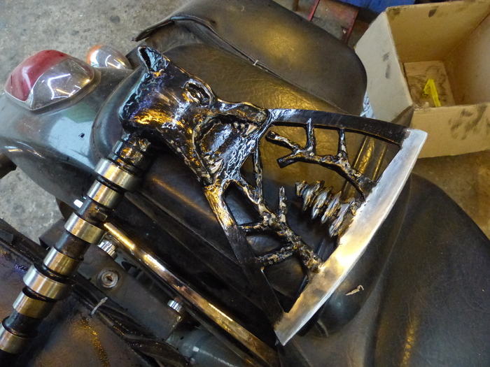 Собственно самого волка решил изобразить на обухе топора. "нарисовал" пару голов волка. Выбрал второй вариант.