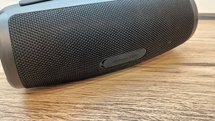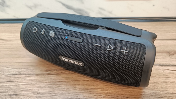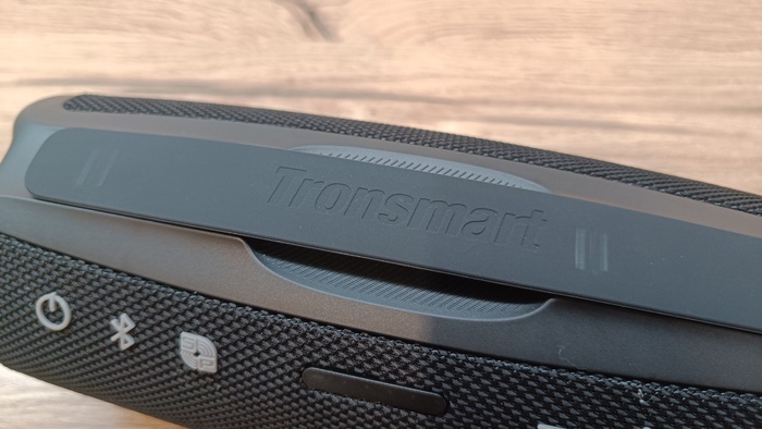Внешний облик Tronsmart Mirtune S100 выдержан в традиционном стиле, с небольшой выпуклой центральной частью. Одной из ярких особенностей гаджета служит встроенная телескопическая ручка для комфортной транспортировки. Когда ручка сложена, она элегантно прячется внутрь корпуса, становясь незаметной. При необходимости её можно легко выдвинуть одной рукой, превращая в практичную эргономичную петельку из мягкой силиконизированной ленты. Такая форма позволяет крепко удерживать устройство, а возврат в первоначальное состояние выполняется элементарно легким нажатием на ручку.