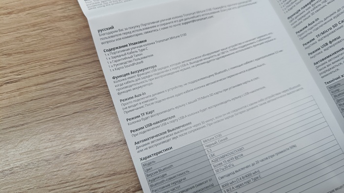 — Колонка Tronsmart Mirtune S100; — Зарядный шнур USB Type-C; — Яркая красочная инструкция на нескольких языках; — Информационный буклет Sound Pulse с дополнительной рекламой продуктов компании.