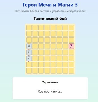 Так же я попытался исправить боевую систему и сделать ее ближе к оригинальным «Героям». Она должна была выглядеть так: поле 8*8 клеток, воины дальнего боя атакуют с любого расстояния, ближнего – только с расстояния в одну клетку. Кроме этого, персонажи могут тратить действия на движение либо на атаку.