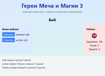 В отсутствие противника (я побоялся добавлять его во избежание крашей), целью игры было зачистить карту от монстров. Это было бы слишком просто сделать, если бы у монстров отсутствовала бы какая-либо прогрессия. Поэтому я добавил правило: при нажатии кнопки «Новый день», количество монстров во всех нейтральных лагерях увеличивается на 1. Это не сильно усложняет бой с простыми монстрами типа гоблинов, но вот чтобы победить драконов нужно будет постараться.