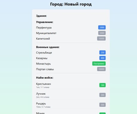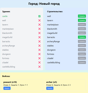 Если мы перейдем в город, то увидим возможность его «отстройки» и найма войск.
