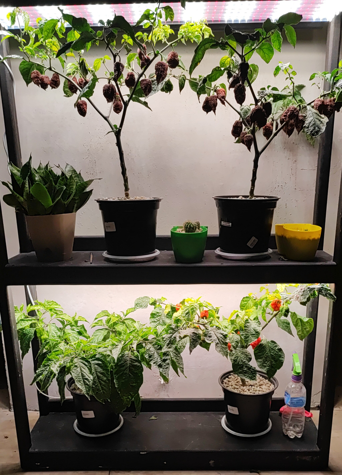 Сооружил полку в мастерской над батареей. Каждого вида закинул по девять семян. Не взошли только два. Лампы фито, но недорогие.
