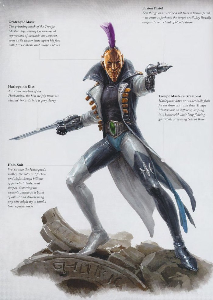 товарищей на изменяющиеся судьбы сражений, чтобы их представление в боевом театре было насколько возможно близким к идеалу. С согласия своих собратьев они становятся средоточием всех успехов и неудач целых трупп арлекинов, и часто самым одарённым из глав даже доверяют руководство представлениями целых масок. Главы трупп являются скорее ведущими актёрами из состава, чем официальными командирами, ведь они возвышаются по воле своих братьев и сестёр и играют свои роли до тех пор, пока другим не приходит время занять их место. Они становятся образцами всех важных особенностей своей труппы, воплощая в себе всё, что значит быть Светом, Тьмой или Сумерками. Поэтому главы трупп света бросаются в бой, словно отважные герои древних легенд, принимая такие агрессивные и достойные роли, как Герцоги Тайных Царств или Князья Эльданари. Являющиеся их противоположностью главы трупп Тьмы представляются зловещими и мстительными, всегда стремясь сделать гибель врага как можно более яркой и зрелищной. В свою очередь главы трупп сумерек видят во всём циклы переходов и часто кажутся охваченными навязчивыми идеями или безумием в своём внимании к тонкостям и подробностям, до самого момента раскрытия их истинного гения.