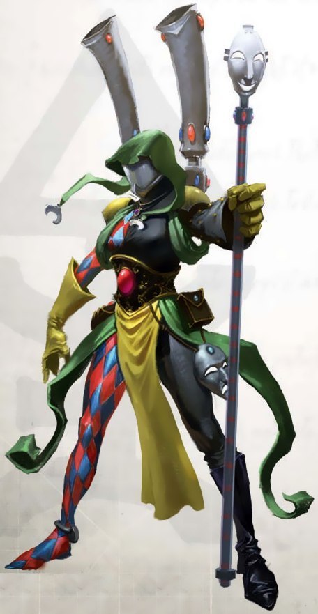 Шуты Смерти ходят среди масок куда хотят, облаченные в броню, по слухам, содержащую кости их предшественников. Собратья относятся к ним с настороженным весельем, зная, что такие арлекины настолько же непредсказуемы и жестоки, насколько и талантливы. Но их верность Смеющемуся Богу является неоспоримой, и в гуще боя огневая поддержка Шутов Смерти вновь и вновь спасает жизни их товарищей. Стоит отметить, что по старому бэку среди Шутов Смерти встречались и люди.