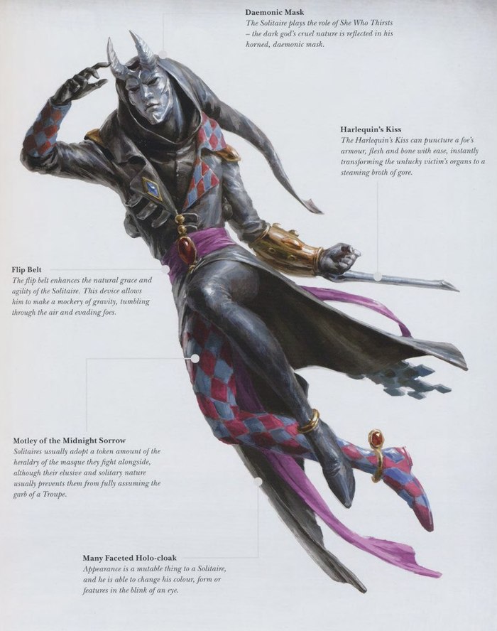 Они являются и самыми странными из арлекинов, скрываясь среди жителей Комморры или искусственных миров, странствуя в чужом обличье. Лишь иногда эти ужасные эльдары открывают чудовищную суть, таящуюся под внешне безобидной маской, присоединяясь к представлению или битве, а затем исчезают вновь. В такие времена они говорят и слушают лишь ритуальные слова, вызывая суеверный ужас у большинства эльдаров. Это вызвано тем, что среди всех арлекинов лишь солитэры играют роль Слаанеша, вызывая одновременно неподдельный ужас и уважение. Это также делает их самыми опасными из всех арлекинов, ведь солитэры идут по Пути Проклятия, а их душа обречена быть пожранной Той-Что-Жаждет. Знание о погибели души означает, что солитэры заставляют врагов воистину дорого платить за свою смерть.