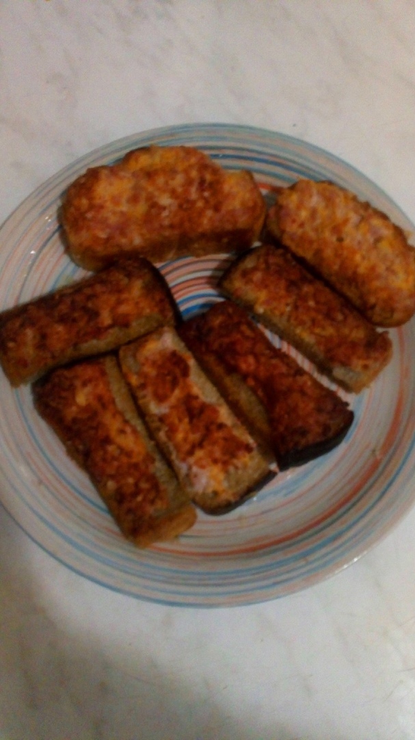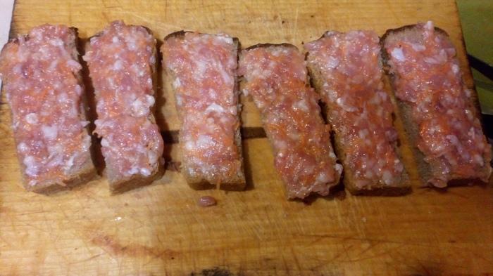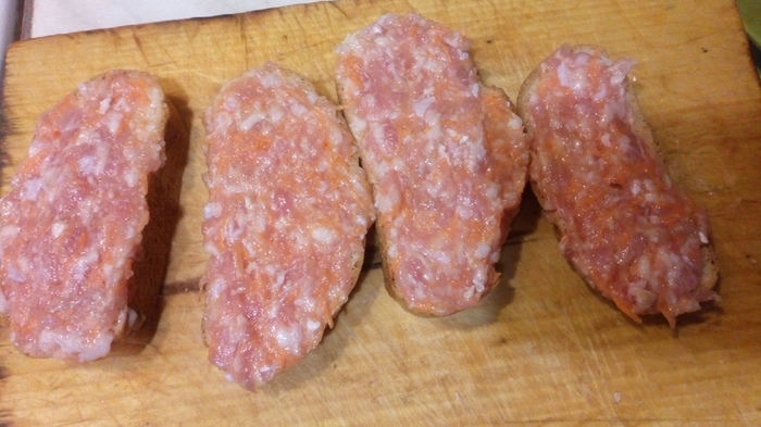 Как вы помните вчера у нас осталась заготовка из фарша и моркови для завтрака. Из неё получились бутерброды "мордой вниз". Намазываем данную смесь на имеющийся у нас хлеб, у меня оставшийся батон и хлеб, и кладем намазанной стороной вниз, на сковородку.