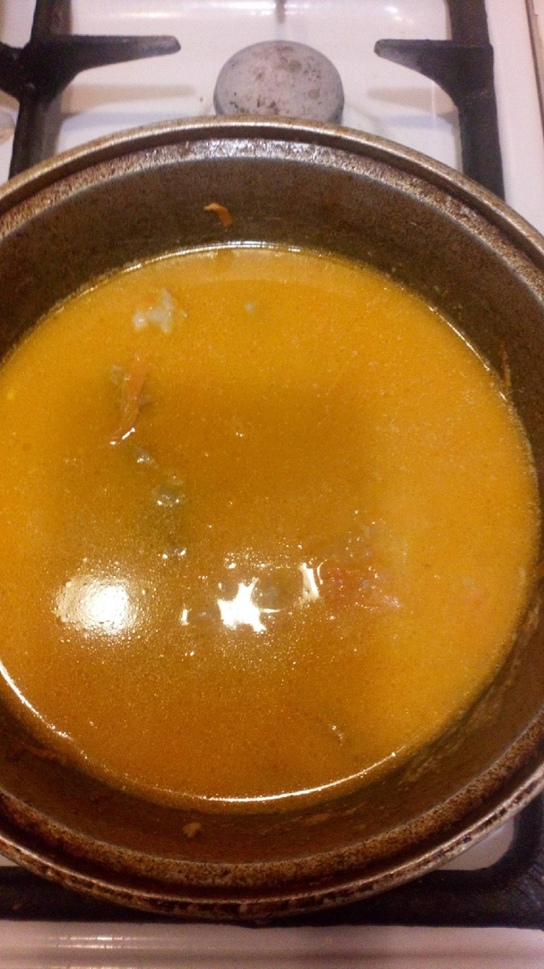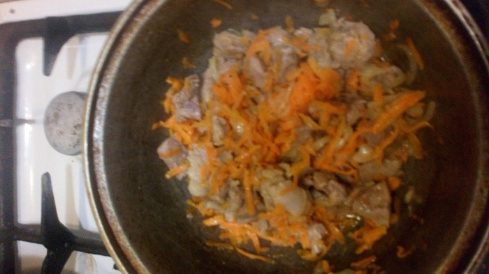 После чего добавляем нарезанный полукольцами лук и морковь, предпоследний кусочек из морозилки....Перемешиваем и протушиваем минут 5-10.