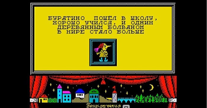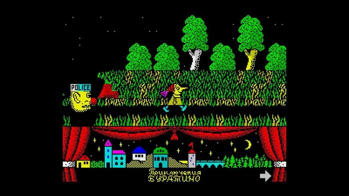Самая русская игра. Да, русские программисты тоже умели в спектрум. И не только играть. Особенно отличался Медноногов. Copper Feet. Сu и нога на логотипе. Он же не спектруме сделал мегахит - НЛО, враг неизвестен, и продолжение - НЛО2, не помню название. (думал почему то что называется Черный ворон, но ошибался). Суть Буратины проста - квест. Чапаете по карте и встречаете знакомых сказочных персонажей. Сказку все помнят, что делать понятно, а русский язык в то время в игре - услада для глаз.