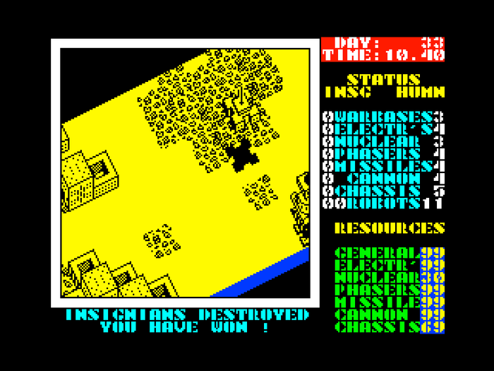 Самая инновационная игра. 1987 год. Стратегий тогда не было никаких вообще. А это - одна из их прародителей. На землю нападают роботы. Вы летаете в квадратном командном модуле, и творите стратегию. Напрямую модуль стрелять не мог. было только несколько стартовых ресурсов, из которого можно было себе склепать робота, и отправится воевать с захватчиками. По мере завоевания можно было отвоевывать заводы, производящие компоненты для роботов. Когда ресурсов становилось много, можно было позволить себе дополнительных роботов, которые воюют за вас - наклепать их на базе, запрограммировать на нужные действия (захват и защита, атака, захват баз и т.п.), и отправить в бой. Для роботов можно было выбрать несколько типов траков. самый лучший на антигравитационной подушке - робот перелетал через щели в земле. Несколько видов оружия - ракеты, пушка, фазеры. и можно снабдить улучшенными мозгами. Двигаетесь направо вверх по карте, и навстречу идут захватчики. Всё в реальном времени. Супермегахит).