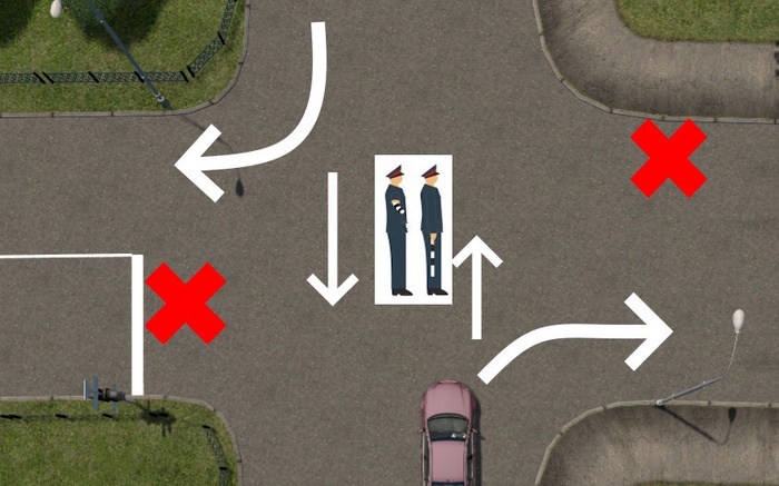 Когда правая рука вытянута вперед, то со стороны груди регулировщика можно двигаться только направо.