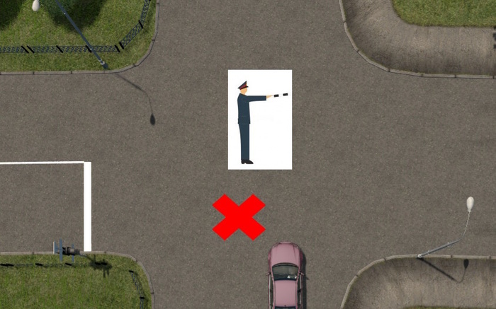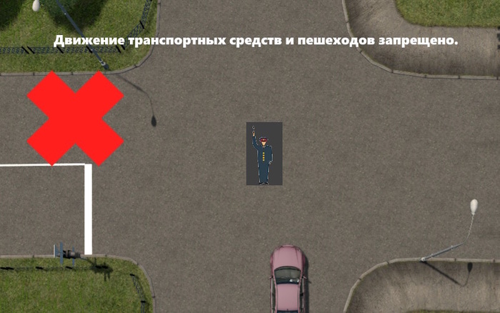 Двигаться трамваю запрещено со стороны груди и спины регулировщика, когда у него руки вытянуты в стороны или опущены.