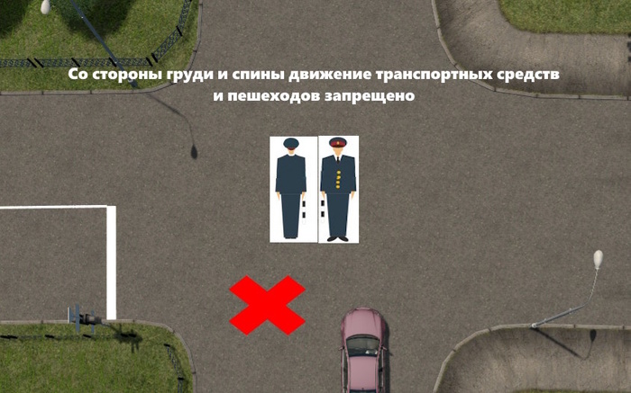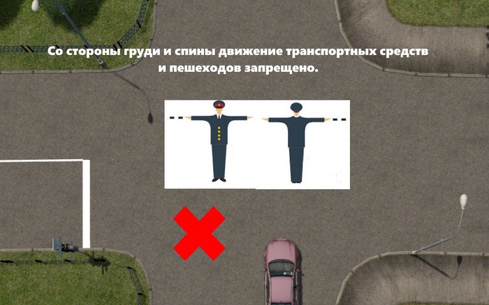 Движение запрещается со стороны груди и спины при сигнале регулировщика в виде опущенных рук или рук вытянутых в стороны.
