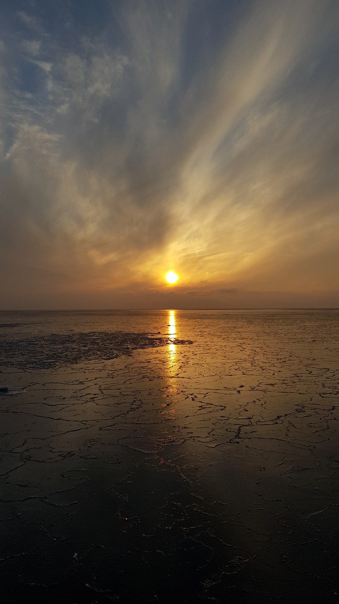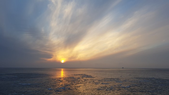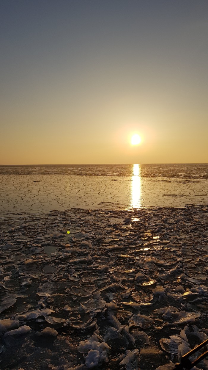 Закат,которого не увидишь на берегу. Отражение на льду придаёт дополнительной красоты.
