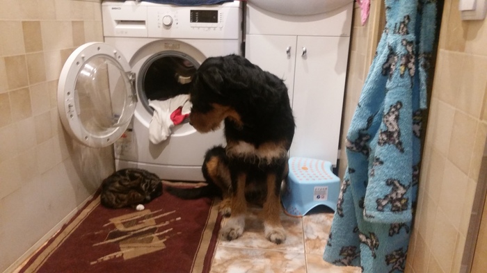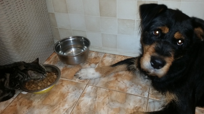 В начале зимы, на огород подбросили котенка. Ночевал он в теплице бедняга, где и был пойман и накормлен. Для котенка перспектив было не много, либо замерзнуть ночью, либо быть сьеденым лисами. Решил взять этот клубок шерсти домой, благо жена любит животных и шансы ночевать с котенком на улице сводились к нулю. Опасения вызывала собака, которая уже 4 года живет с нами. Как она отреагирует на этого маленького зверя. Оказалось боялся я зря, уже через неделю, когда это пушистое чудо освоилось и почувствовало себя в безопасности, начало наглеть в геометрической прогресии. Собака от такой нагласти в шоке. И все время смотрит на меня, типо хозяин какого ... что это такое, помоги..