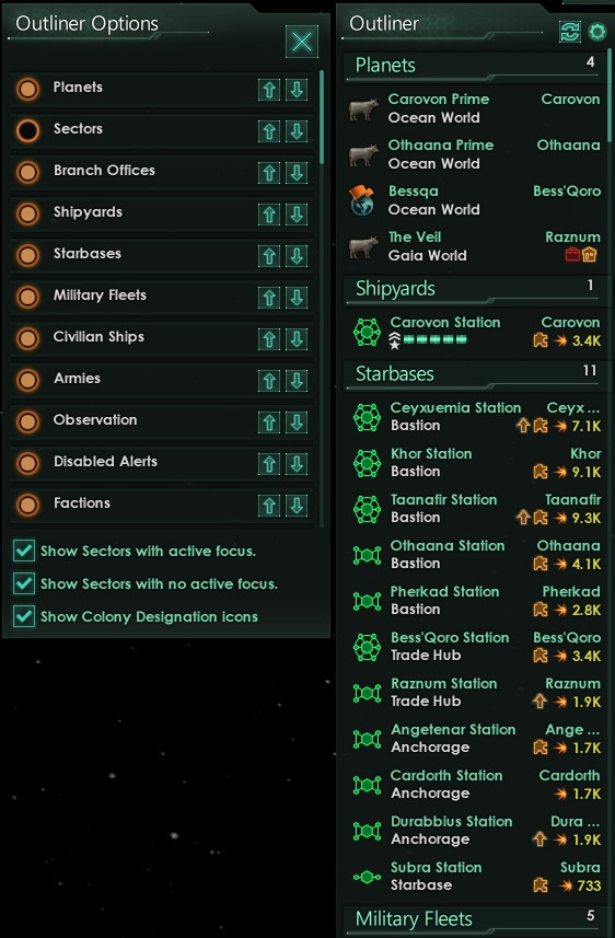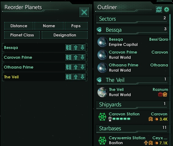 Планеты можно перемещать внутри списка сектора или всего списка планет, в зависимости от того, какая опция выбрана.