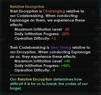 В ранних вариантах, когда модификатор назывался по-разному в разных местах, это немного смешивало показатели и было сложно сказать, что будет больше полезно при попытке внедриться в государство. Мы переименовали расшифровку, чтобы избежать ещё большей путаницы. Относительная шифровка в этой системе используется часто, и теперь всегда будет сравнивать взлом кодов «нападающего» государства с шифровкой «защищающегося».