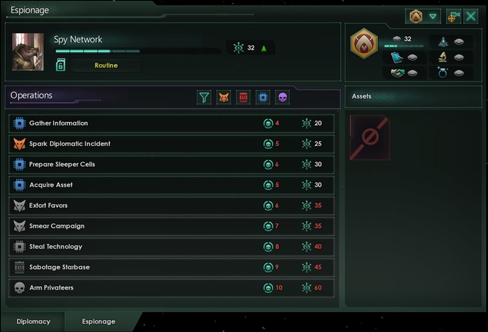 Мы сильно упростили интерфейс операций, убрав кучу чисел, связанных с сетью и самими операциями. На волне упрощений мы также удалили понятия шпионской силы и пропускной способности, так что теперь нельзя проводить несколько операций за раз против одного государства — только по одной. Это также решает возникшую на этапе тестирования проблему, что не всегда сразу было понятно, к какой именно операции относится случайное событие, поэтому следить за ходом операций теперь в целом легче.