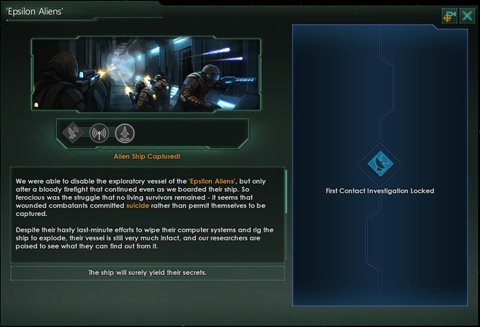 Законченный интерфейс первого контакта. Силуэт в нижнем правом углу должен быть общим, и изменится на портрет чужой расы, когда вы достаточно продвинетесь в цепочке событий первого контакта.