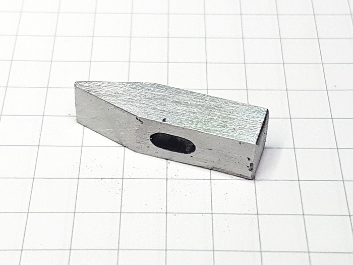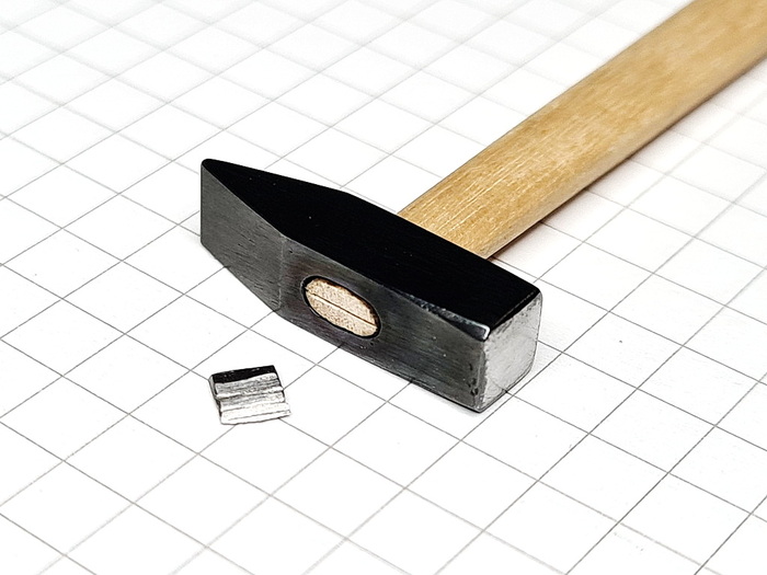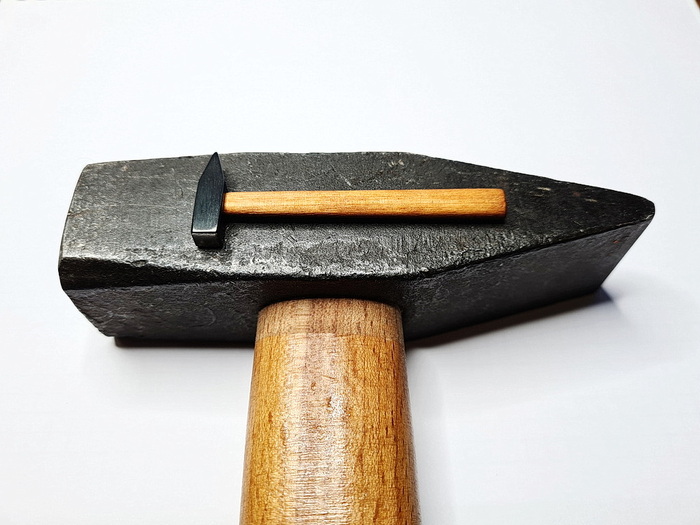 Действующая модель молотка в масштабе 1 к 6, выполнена из обрезка стальной полосы 40 х 6 мм. Рукоятка изготовлена из берёзовой щепки. Клин – кусочек стальной пластинки из обрезков. Где этот молоток можно применить? Ну...эээ... помогите мне придумать какой-нибудь вменяемый ответ на этот вопрос!