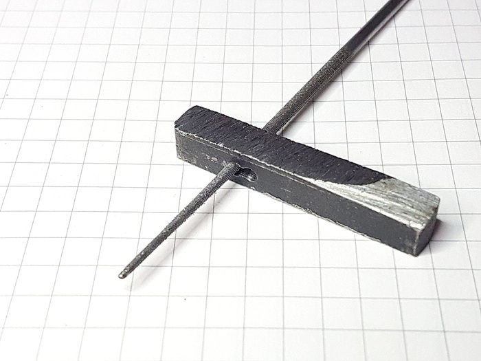 При помощи надфилей (маленьких таких напильников) из двух круглых отверстий делаем одно овальное.