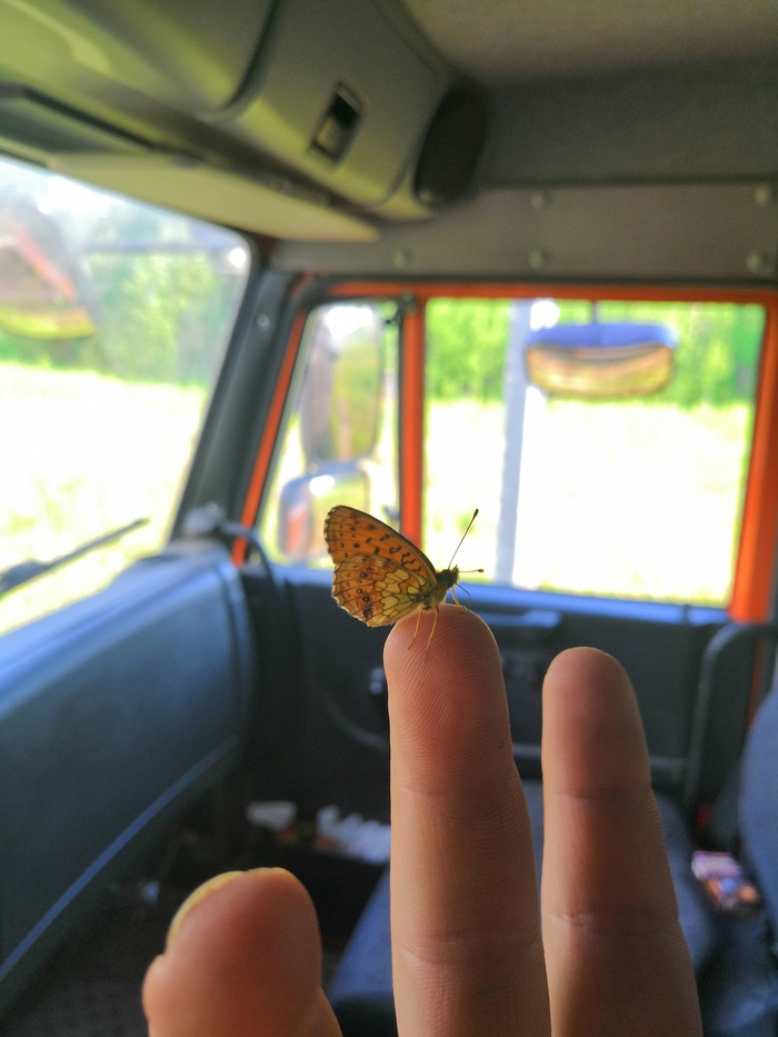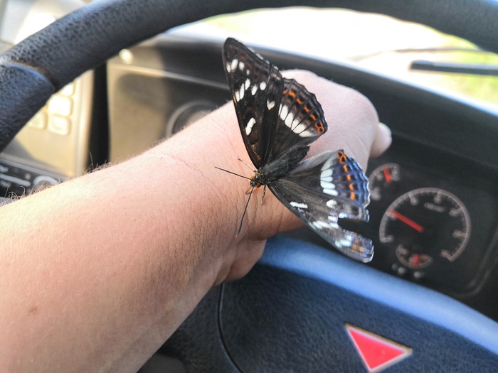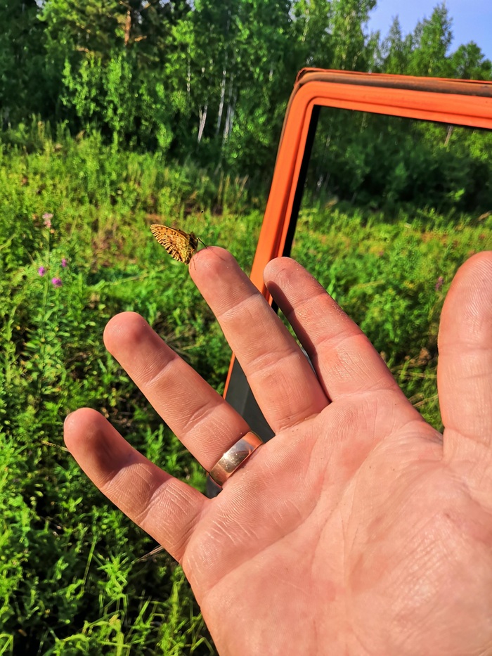 Вот заметил в лесу, там где далеко от цивилизации насекомые бесстрашные, от этой бабочки в жару +25 мне пришлось все двери и окна закрыть и париться пока она не улетела так как не хотел ее крылья повредить но и .... Блин она мне надоела то сядет на нос то на лоб. 😂 на ладонь когда садилась интересно было наблюдать как она хоботком что то искала на моей руке, может думала что я цветок, но после недельной жизни в лесу я точно не пах цветком😂😂