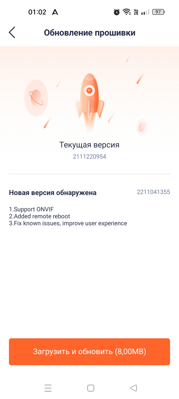 В настройках появилось уведомление и новой версии прошивки, я её обновил - 2-3 мин с перезагрузкой камеры. Громкий женский голос комментировал действия.