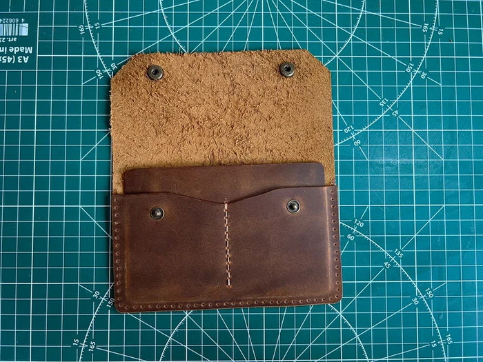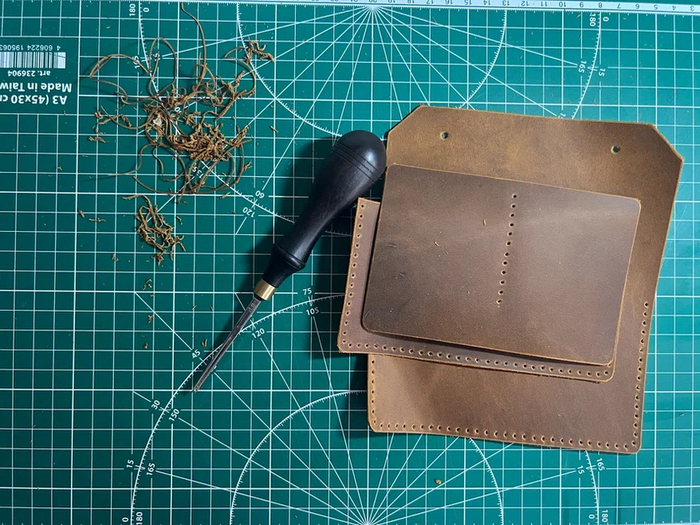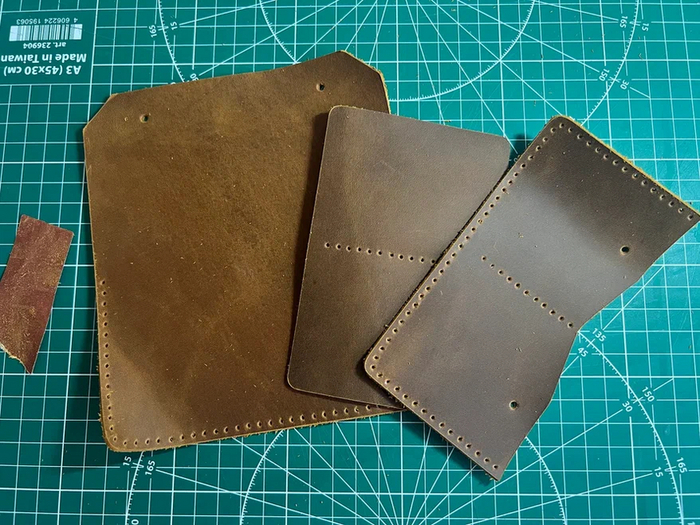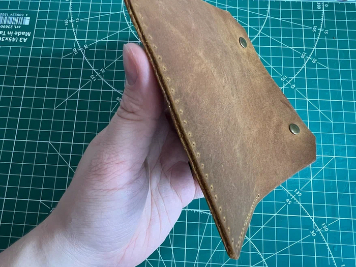 Прошил изделие с помощью нити 0,55 galaces. После этого прошелся уже по торцам наждачной бумагой, сначала с крупным зерном и после этого с более мелкой зернистостью. И обработал кожу токонолем.