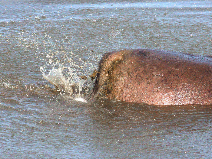Второе применение остатков жизнедеятельности — угроза конкурентам. Заслышав приближение агрессивных сословий, бегемот делает залп. Коротенький хвостик он использует в качестве пульверизатора. Размахивая им на манер пропеллера, гиппопотам разбрызгивает фекалии.