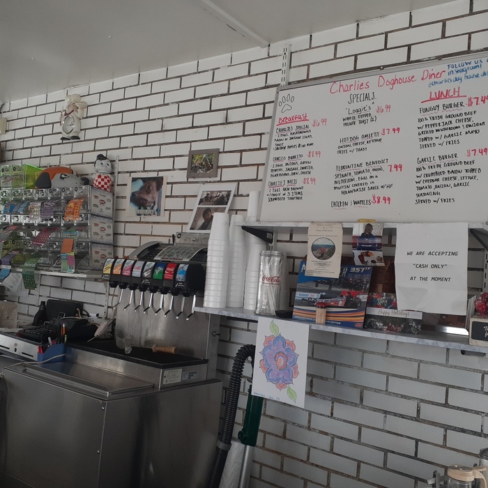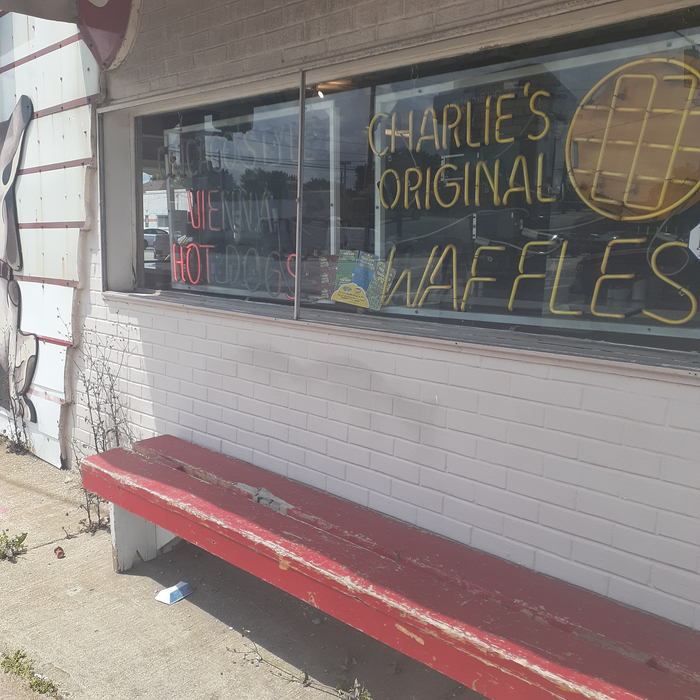Здание имеет фасад, похожий на собачью будку, и двух раскрашенных гончих, которые смотрят в обе стороны от входной двери, прямо под классической вывеской Coca-Cola, неоновые огни, обещающие венские хот-доги в чикагском стиле и оригинальные вафли Charlie's, и шатер с надписью «Charlie's Restaurant». Он может вместить 12 человек. Разумеется, я не могу сказать, насколько он загружен по утрам. Я могу себе представить, что он достаточно загружен, чтобы все эти годы спустя все еще работать.