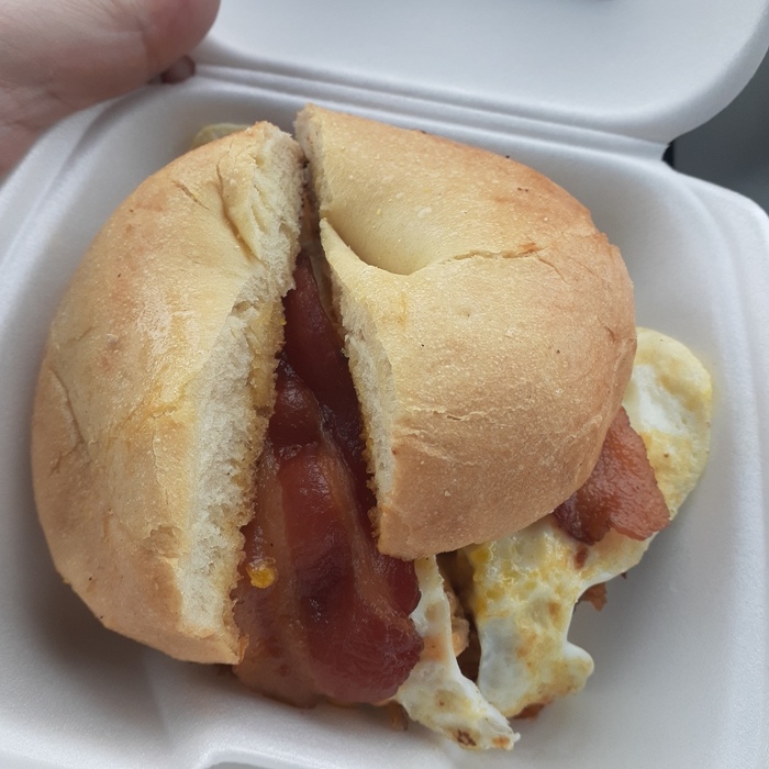 Я заказал бублико-сэндвич на завтрак, чтобы просто посмотреть, что это такое. За $3.99 я получил восхитительно мягкий бублик с беконом, хорошо прожаренное яйцо (на этот раз желток не попал на меня), сыр и картофельные оладьи. Это был приличный, выгодный сэндвич на завтрак.