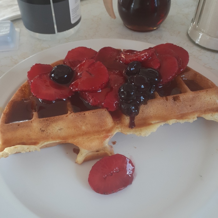 также хотел попробовать их вафли, но знал, что еды там много. Официантка предложила мне заказать половину вафли (да, это возможно!), поэтому я раскошелился и добавил к ней клубничную и черничную начинку. Вафля была легкой, хрустящей и сочной внутри. Добавление фруктовой начинки было вдохновенным выбором. Мне очень понравились фруктo- вафли. Я съел половину всего, а затем забрал остатки домой. Я сделал день парню, попрошайничающему у съезда на Карнеги, когда я отдал ему свои остатки.