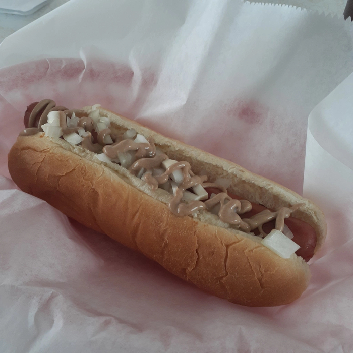 У них в меню несколько хот-догов. Поскольку мы не в Чикаго, я решил не заказывать Chicago Dog. Я просто не могу представить, чтобы в Кливленде его делали правильно. Вместо этого я заказал Cleveland Dog. Это восхитительный венский хот-дог, посыпали его рубленым луком и горчицей Stadium. Абсолютно божественно.