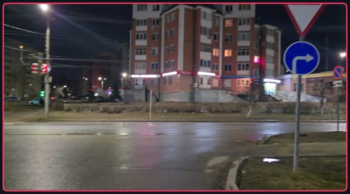 Сам инцидент произошёл вне перекрестка, а легковушка выезжала в нарушение знака «Поворот только направо» (светофор на этот выезд никак не распространяется).