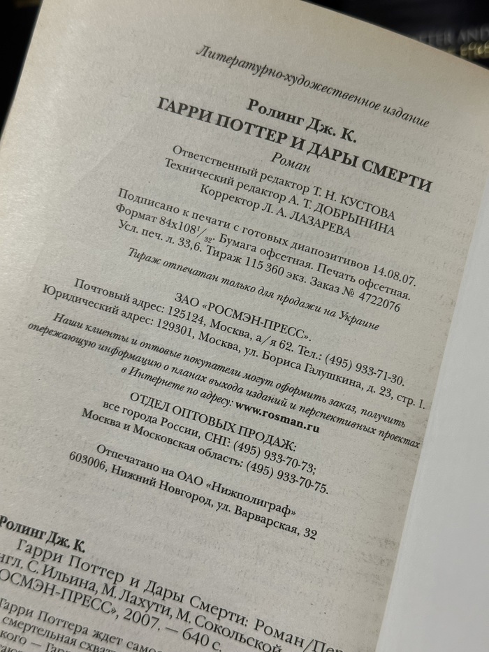 Из интересного: у Нижегородской типографии, где была отпечатана эта книга, есть тираж Даров смерти с той же датой подписания печать, но с другим количеством (184 800 экземпляров) и без строчки про Украину. А эта часть тиража вышла в количестве 115 360 экземпляров. При этом номер заказа у них одинаковый (№ 4722076). Если сложить их вместе, получается 300 160 экземпляров... Для меня загадка, откуда взяли эти «лишние» 160 книг. Возможно, Галина из бухгалтерии Росмэна приказала сделать тираж именно таким, чтобы сошелся дебит с кредитом :)