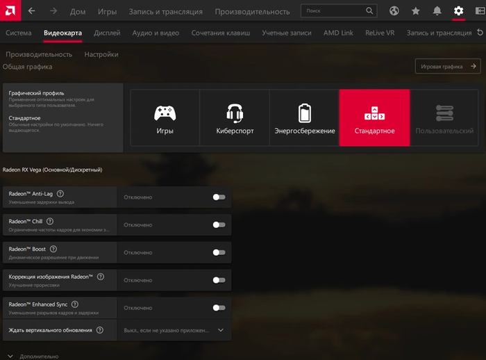 Профиль «Игры» отличается включенным по умолчанию Radeon Anti-Lag и коррекцией изображения с параметром резкости, установленным на 80 %. Профиль «Киберспорт» обладает такими же настройками, за исключением максимального уровня тесселяции — здесь она ограничена параметром 8x. В профиле «Энергосбережение» вышеописанные технологии отключены, зато активен Radeon Chill. Профиль «Стандартный» предлагает настройки по умолчанию. Помимо готовых профилей, можно менять настройки и вручную — профиль при этом автоматически сменится на «Пользовательский».