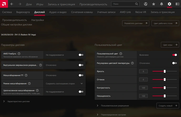Помимо «Общей графики», рядом находится кнопка «Общие настройки дисплея». Именно там можно активировать технологию адаптивной синхронизации FreeSync, если ее поддерживает ваш монитор. Рядом находится регулировка цвета, а также переключатель режимов масштабирования и VSR — виртуального сверхвысокого разрешения. С его помощью можно запускать игры в разрешении выше нативного разрешения монитора, что дает эффект сглаживания, аналогичный избыточной выборке, подробнее о которой расскажем далее.