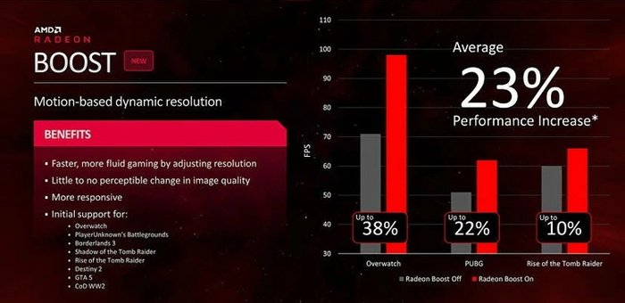 Radeon Boost пригодится при нехватке производительности. Во время движения в игре он снижает разрешение рендеринга для повышения частоты кадров. Уровень снижения регулируется пользователем — доступны значения от 50 % внутриигрового разрешения.